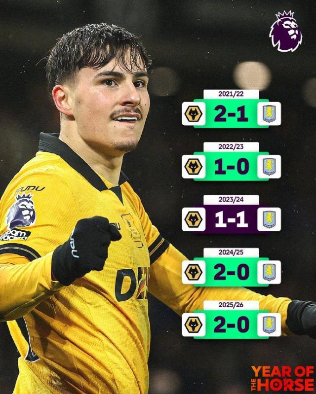 英超第28轮先赛一场,维拉客场“爆冷”0比2不敌狼队,“爆冷”之所以打引号,是因为维拉输狼队其实并非小概率事件——狼队尽管身处降级区,但近5次主场对维拉的中部德比保持不败,赢了4场,是妥妥的维拉克星。而且维拉本来就近况不佳,各项赛事近6场比赛只赢了1场(主场1比0布莱顿),输了3场。
